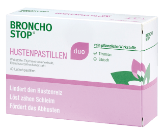 Egalob Reizhusten, festsitzender Schleim oder produktiver Husten: BRONCHOSTOP® duoHustenpastillen lindern den Hustenreiz, lösen zähen Schleim und fördern dasAbhusten. Sie sind die praktische Lösung für unterwegs, um den lästigen Hustenerfolgreich zu lösen. Die im Eibisch enthaltenen Schleimstoffe hüllen die imRachen befindlichen Hustenrezeptoren ein, lindern so Schleimhautreizungen undreduzieren dadurch den Hustenreiz. Die wertvollen ätherischen Öle des Thymiansgelangen nach der Einnahme tief in die Bronchien und lösen zähen Schleim,fördern das Abhusten, entkrampfen die Bronchien und wirken lokal antiseptisch.